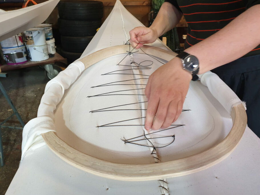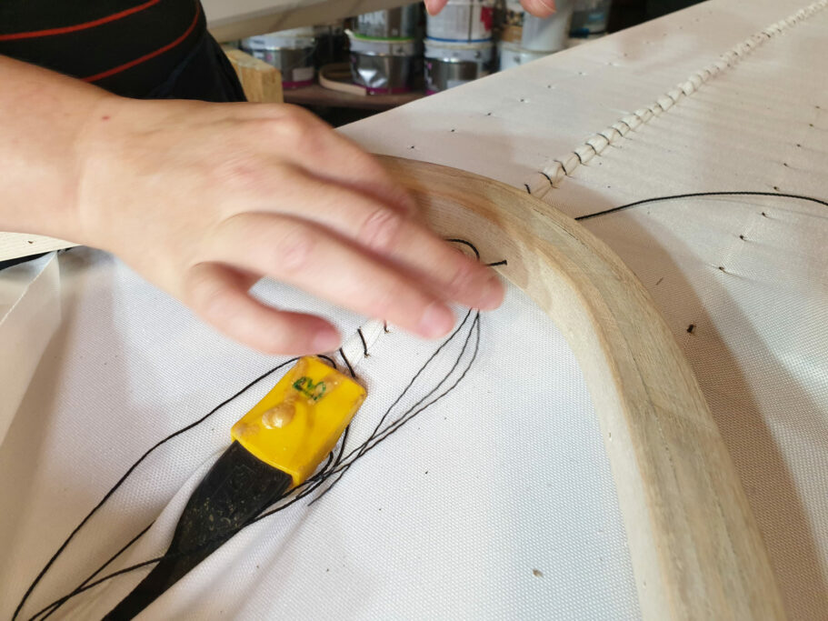 - We sew a couple of stitches at the front middle to keep the coaming dead center