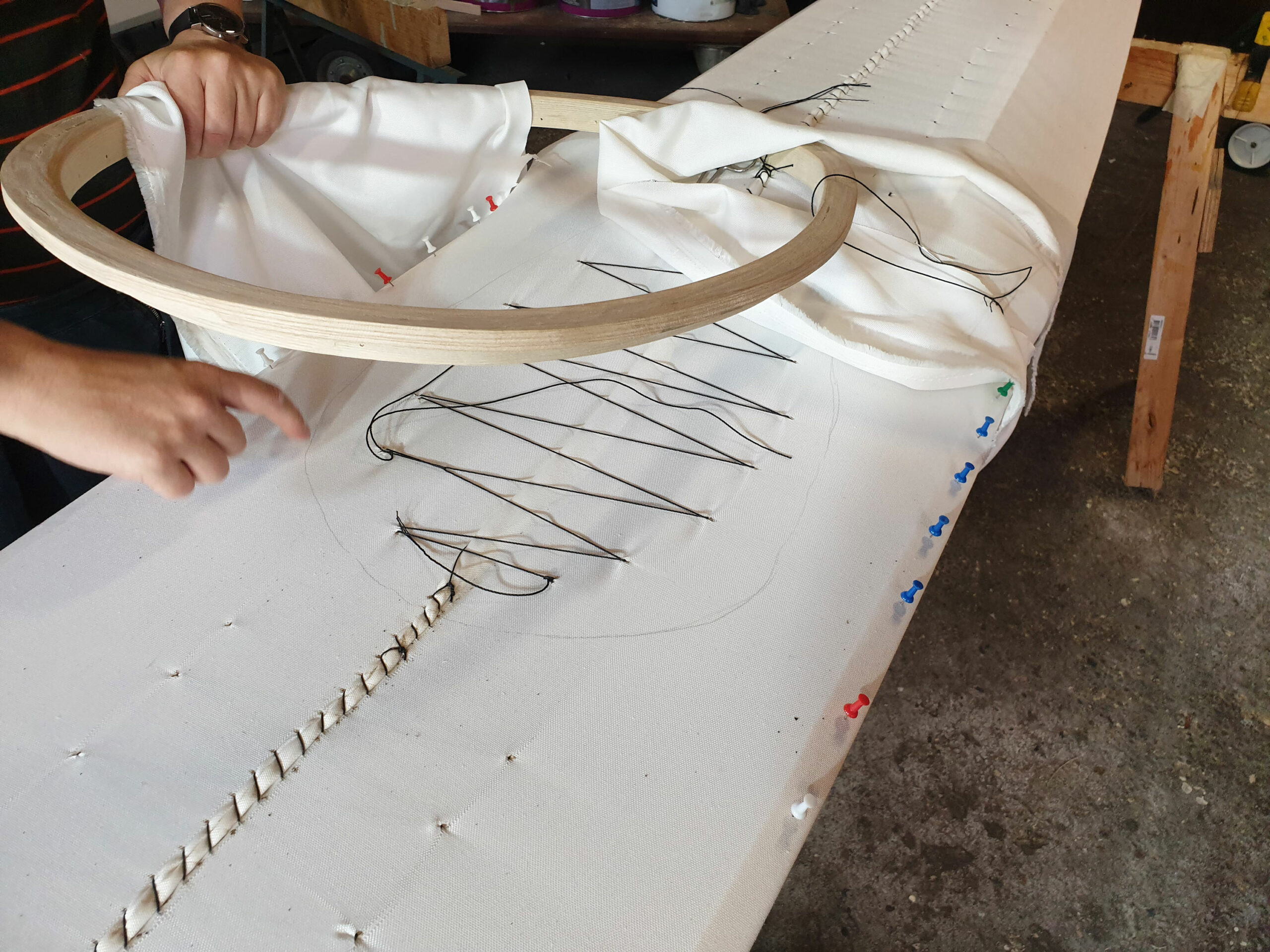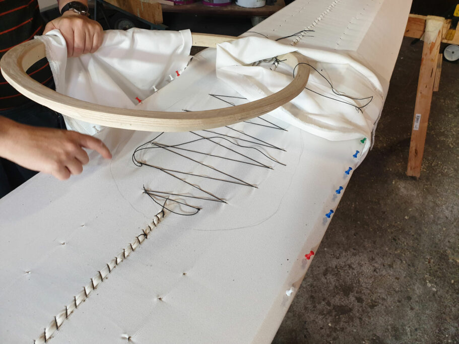 - Once the extra zig-zag has tightened the cloth to the max, we secure the cloth with pins