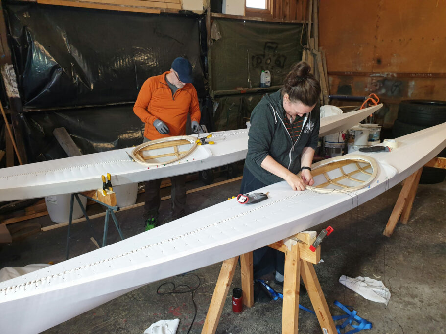 Celebration day, yay! Today Carro & Rick finished sewing their kayaks. This marks the 21st day of building according to Carro.