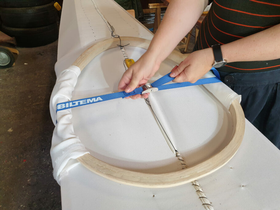 - Our brand new cam straps which hold the coaming while sewing, might have a light silicone coating from the factory which can transfer to the kayak fabric and coaming. So we shield or tape where the straps are tight against the material. Oil and silicone are bad for Polyurethane stickyness.